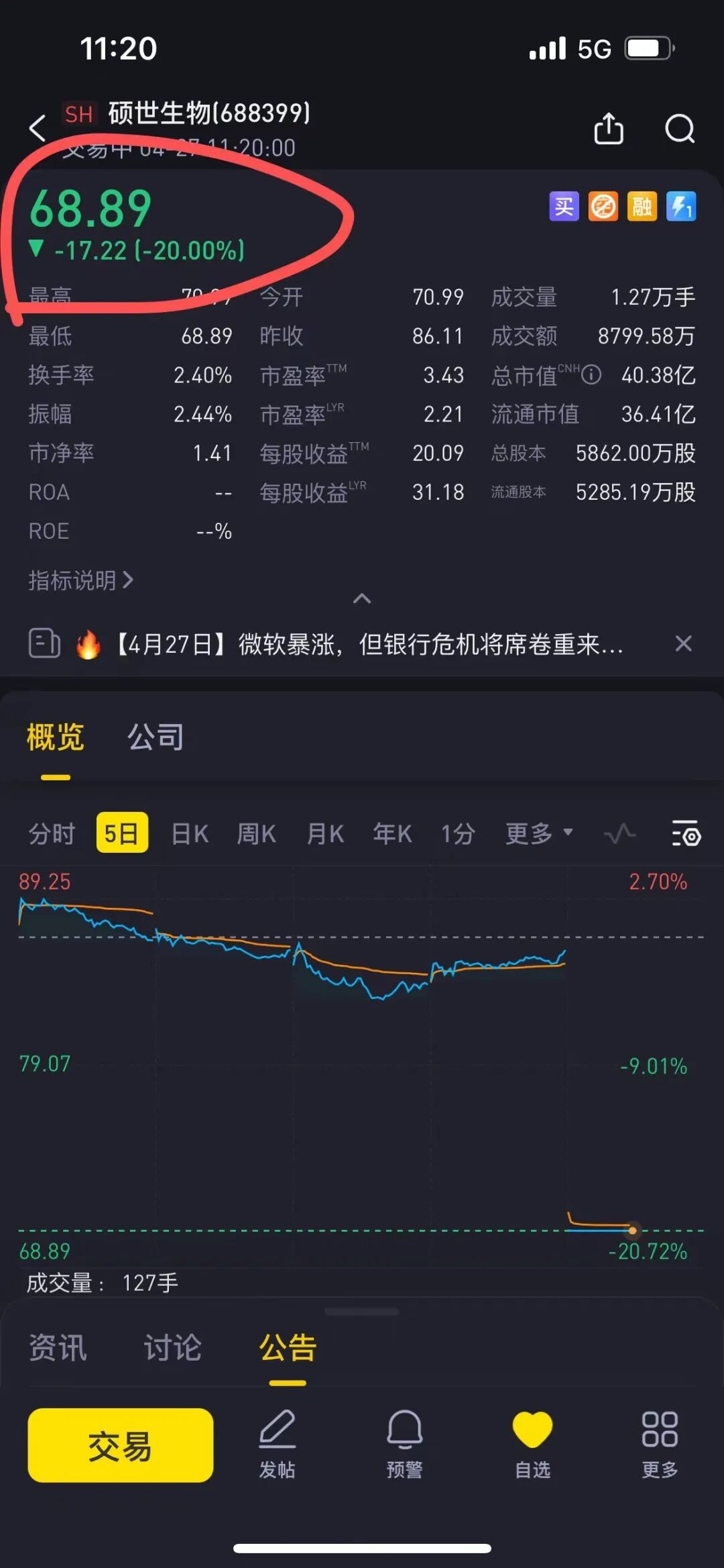4月27日午休,硕世生物暴跌20%,报68.89元。