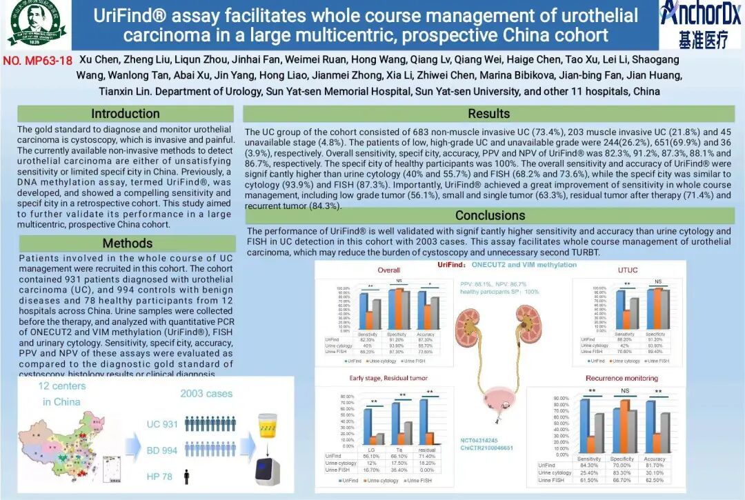 泌尿系统肿瘤是威胁中老年男性健康的常见“杀手”。长期以来,尿路上皮癌(UC)患者面临潜伏期长、确诊晚、易复发、治疗手段有限等困境。如何尽早发现泌尿系统隐匿性肿瘤成为临床亟待解决的问题。近年来随着检测技术手段的进步,UC尿液无创诊断经历了细胞学、肿瘤分泌蛋白、染色质异常、DNA 异常的发展阶段。近5-10年,DNA异常已成为膀胱癌诊断的新方向,并展示出了良好的应用前景。基准医疗与黄健教授和林天歆教授团队从2017年至2022年,历时五年,开发了UriFind®DNA甲基化诊断产品,为我国UC的临床诊断痛点带来开拓性的解决方案。