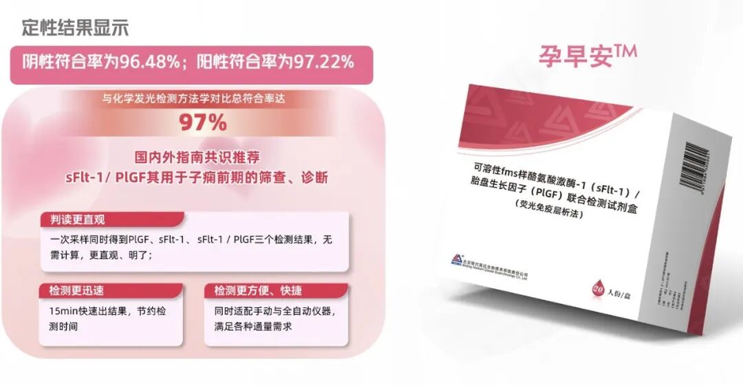 该产品用于体外定量检测孕妇血清中可溶性fms样酪氨酸激酶-1(sFlt-1)、胎盘生长因子(PlGF)的含量。通过sFlt-1/PlGF的比值,对子痫前期进行精准诊断、及时管理,全孕期守护母婴健康。