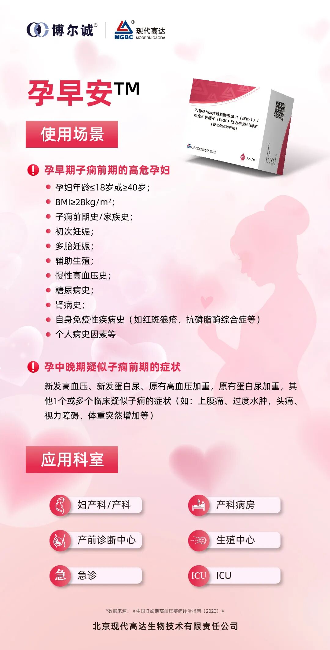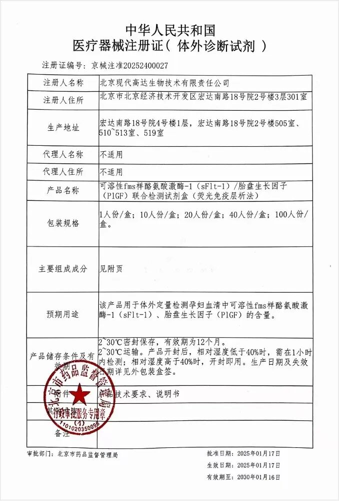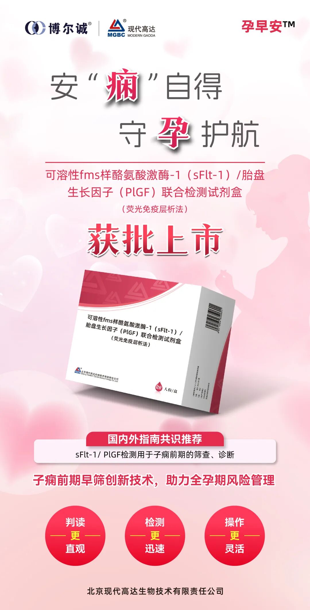 近日,博尔诚旗下全资子公司现代高达自主研发的「孕早安TM」可溶性fms样酪氨酸激酶-1(sFlt-1)/胎盘生长因子(PlGF)联合检测试剂盒重磅上市!