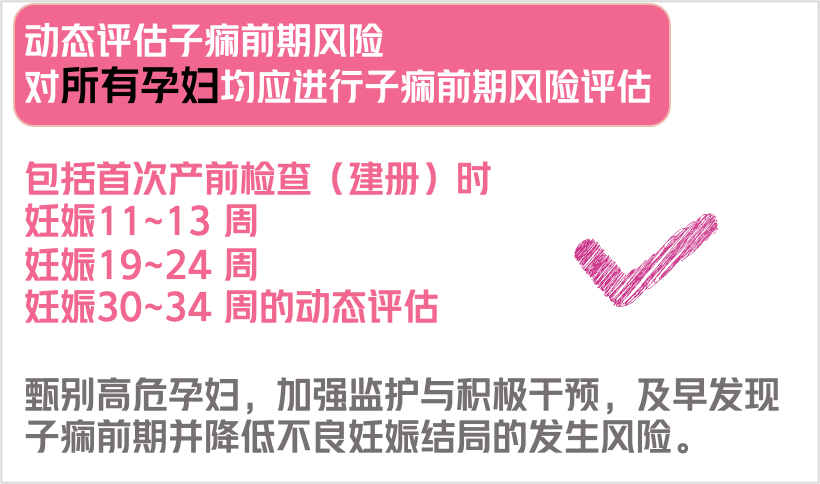 《妊娠期血压管理中国专家共识(2021)》指出,对所有孕妇均应进行子痫前期风险评估,包括首次产前检查(建册)时、妊娠11-13周、妊娠19-24周以及妊娠30-34周的动态评估,甄别高危孕妇,加强监护与积极干预,及早发现子痫前期并降低不良妊娠结局的发生风险。
