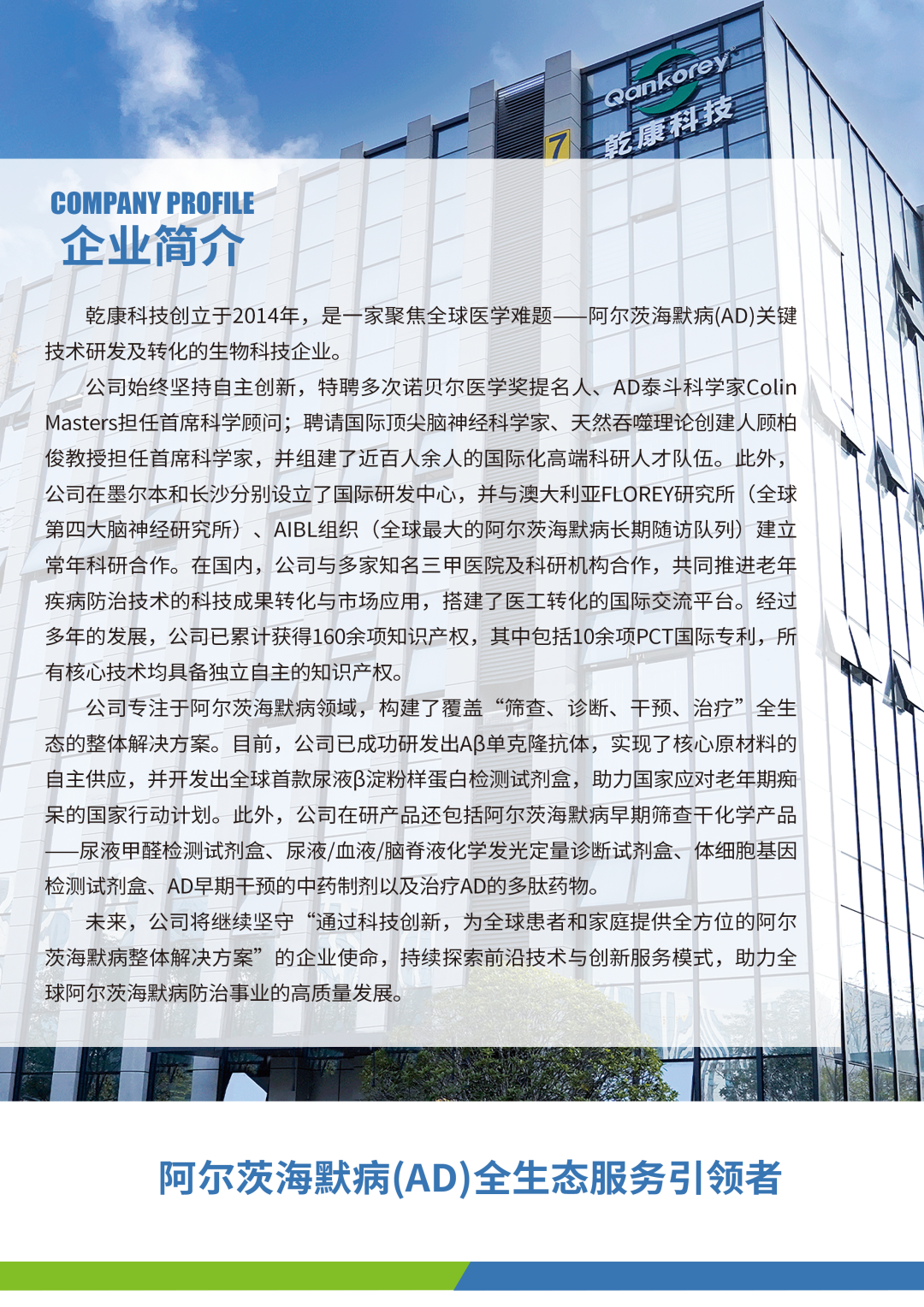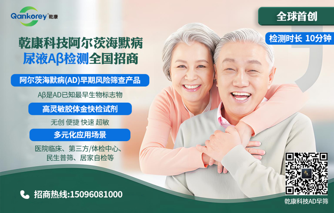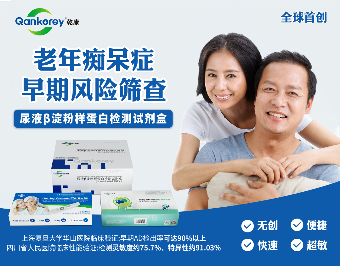 本次项目采用湖南乾康科技有限公司自主研发的阿尔茨海默病(老年痴呆)早期风险筛查产品——尿液β淀粉样蛋白检测试剂盒,相较于量表、传统脑脊液检测和影像学检查等,产品实现“无创、便捷”的早筛突破,具有更早期、更便捷、更快速、更有效、更具普及性等特点;产品突破性实现AD无症状期风险筛查,可提前10-20年发现无症状期AD高风险人群;产品已获得中国、欧洲、日本、卢森堡、澳大利亚五项国际PCT发明专利和科技部《科技查新报告》证明是全球首创及独家技术。