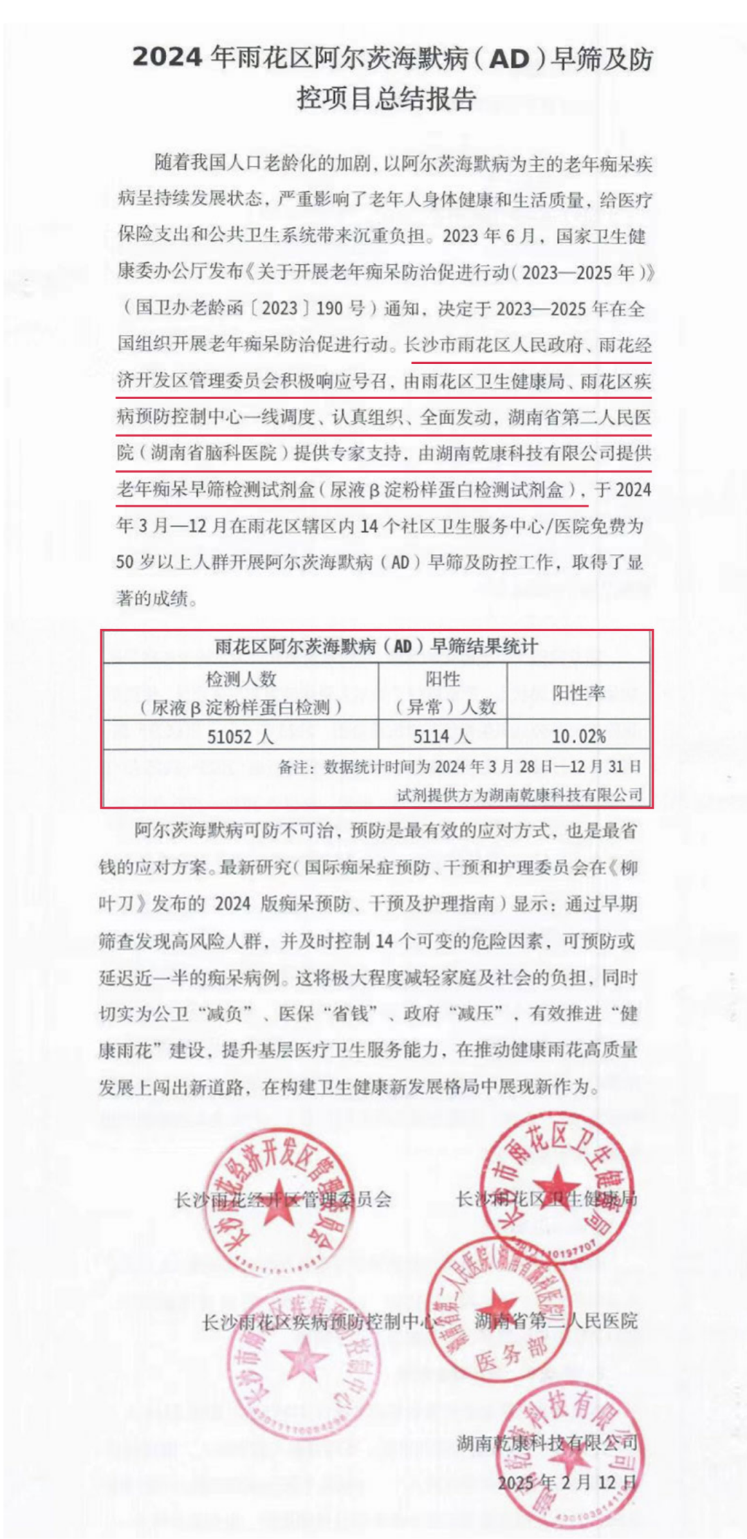 在人口老龄化加速的背景下,湖南省长沙市雨花区率先探索老年健康服务新模式。2024年3月至12月,雨花区人民政府、雨花经开区管委会统筹指导,湖南省第二人民医院(湖南省脑科医院)神经内科专家团队联合湖南乾康科技有限公司,在全区14个社区卫生服务中心(医院)开展大规模阿尔茨海默病(AD)早筛及防控项目,通过采用尿液β淀粉样蛋白检测技术初筛为51052名50岁以上人群进行阿尔茨海默病早筛及疾病防控,成功构建覆盖全区的AD三级防控网络,得到了国家省市区有关部门的充分肯定和高度认可,产生了广泛的社会效益和影响力。