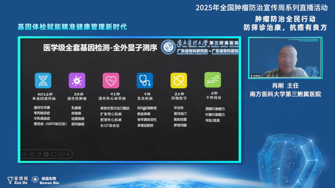 南方医科大学附属第三医院检验科肖刚主任指出,现在已经进入了人人拥有基因组的时代,伯温生物已开发出适用于健康人群精准疾病风险筛查的人体全套基因体检项目,采用全外显子组测序技术,可覆盖人体20000+个基因,准确率达到99%,涵盖遗传病、肿瘤、心脑血管疾病以及安全用药等检测内容和对应的解决方案,结合专业的报告解读,为肿瘤防控、慢病管理、生育健康和安全用药提供指导。他通过H型高血压、苯丙酮尿症、先天性耳聋、蚕豆病等实际案例,深入讲解通过基因体检指导个性化健康管理的重要性。