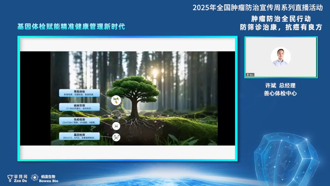 许斌先生表示,在体检方面,常规检查和基因筛查都是目前体检的一部分,并强调了基因体检在预防和早期发现疾病中的关键作用。他指出,基因筛查可以帮助发现隐性遗传病和高风险因素,如乳腺癌、卵巢癌相关的致病基因突变,以及老年痴呆症相关的基因检测。此外,还提到了基因体检技术的进步和成本降低,使得更多人能够负担得起并从中受益,同时他分享了一些实际案例,展示了基因体检如何帮助客户发现潜在健康问题,并采取相应的预防措施。