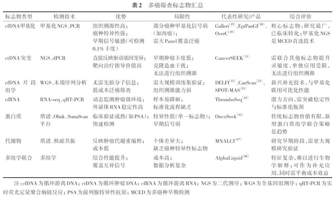 2. MCED的标志物类型:目前,已报道的MCED标志物类型丰富多样,主要包括cfDNA、cfRNA、蛋白质和小分子代谢物等(表2)。