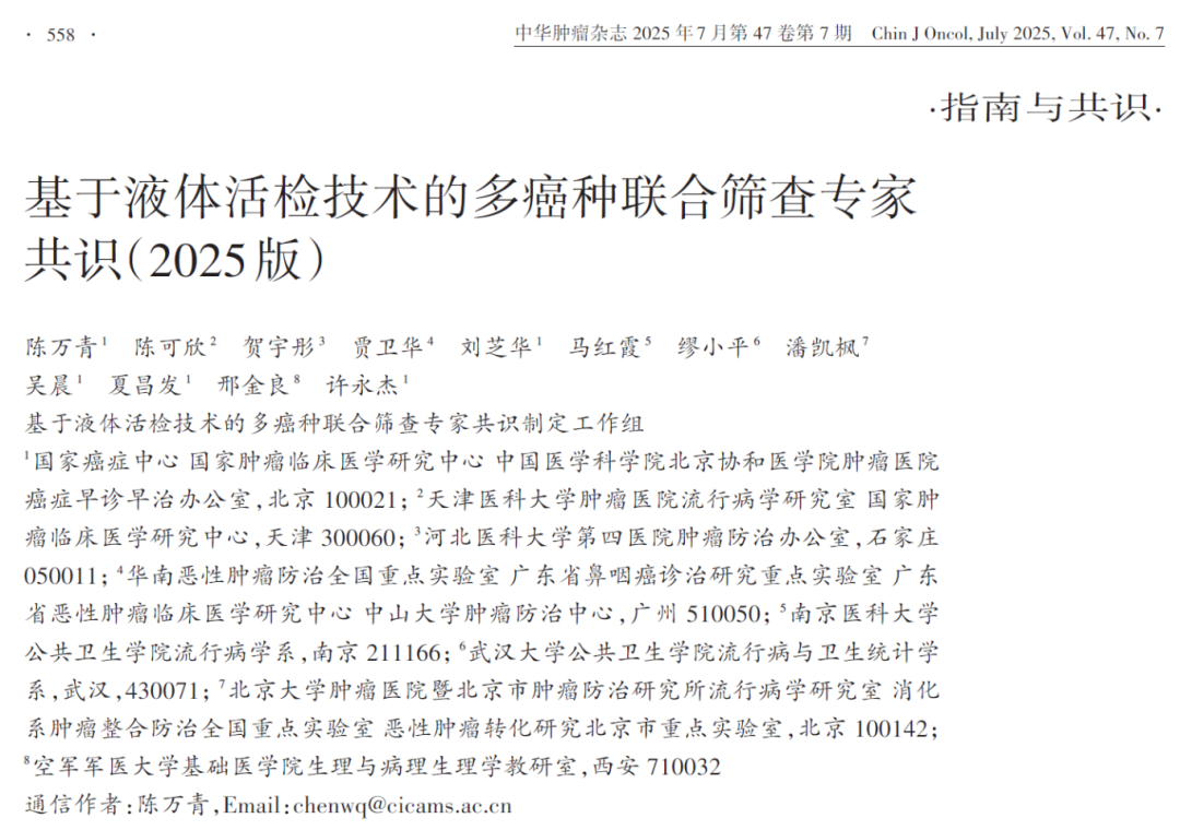 陈万青, 陈可欣, 贺宇彤, 等. 基于液体活检技术的多癌种联合筛查专家共识(2025版)[J]. 中华肿瘤杂志, 2025, 47(7): 558-574. DOI: 10.3760/cma.j.cn112152-20250605-00257.