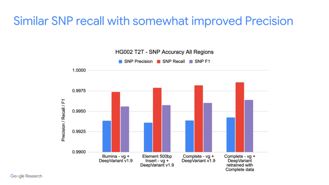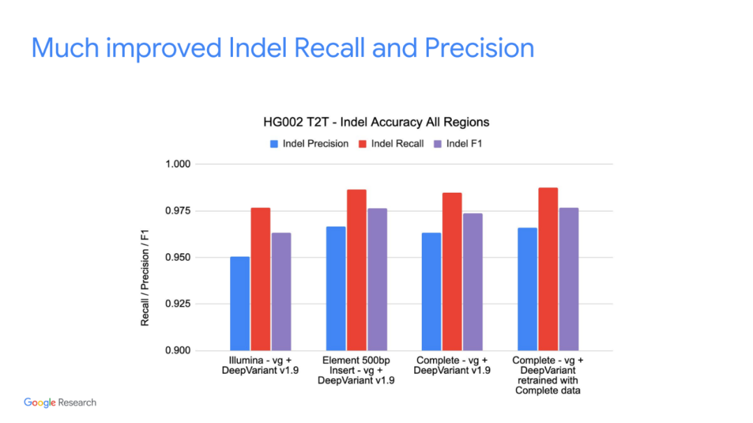 近期发布的HG002 Q100高质量参考基因组,进一步扩充和完善了评估用的变异参考集,极大地填补了以往未覆盖的基因组区域,再次激发了行业对检测精度新一轮的竞争。2024年,DRAGEN结合Novaseq平台的测序数据在HG001–HG007标准品上展现出高精度;2025年,Google基于Element平台的测序数据训练模型,精度进一步超越Novaseq+DRAGEN组合。在2025年ASHG大会上,Google最新研究显示,基于DNBSEQ-T1+平台训练的模型,变异检测精度进一步超越Novaseq和Element平台。这项研究结果不仅为AI模型训练的数据集选择提供了重要参考,更标志着国产测序仪厂商不仅加入了这场前沿竞争,并且凭借其卓越的测序质量获得了关键优势,处于行业领先地位。