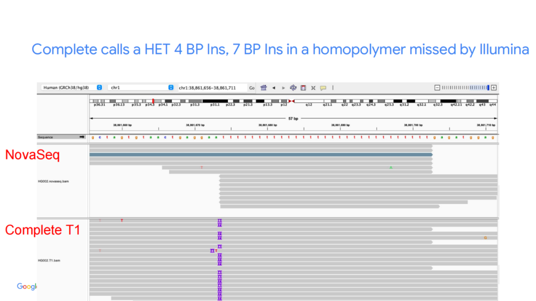 数据的背后,是真实的科研与临床价值。Google Research展示了包括Insertion、 Deletion等多个“实战”案例,结果表明T1+能够检测出Illumina NovaSeq无法识别的变异位点,包括4bp插入、7bp插入等Homopolymer区域的关键变异,进一步印证其检测覆盖的全面性。