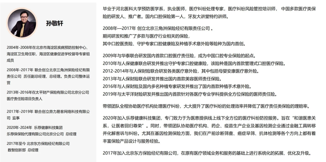 孙敬轩先生的职业生涯始于预防医学领域,在疾控中心从事相关工作。他最早接触保险行业的契机颇具偶然性与前瞻性。2008年,中华医学会注意到国内口腔医疗领域缺乏有效的保险保障,特别是数量众多的民营口腔诊所,在面对医疗纠纷时往往缺乏应对机制。正是这一市场空白,促使他投身保险,并从设计开发国内最早的口腔医疗责任险开始,迈入了保险行业的大门。