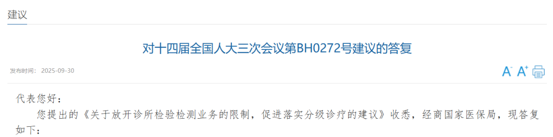 针对这份答复,我们可以看到国家传递的信号:即国家卫健委支持诊所开展检验业务。